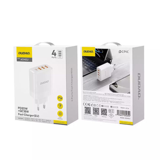Φορτιστής τοίχου Dudao A5HEU με 3 θύρες USB-A και 1 θύρα USB-C με συνολική ισχύ έως 20W – λευκός.